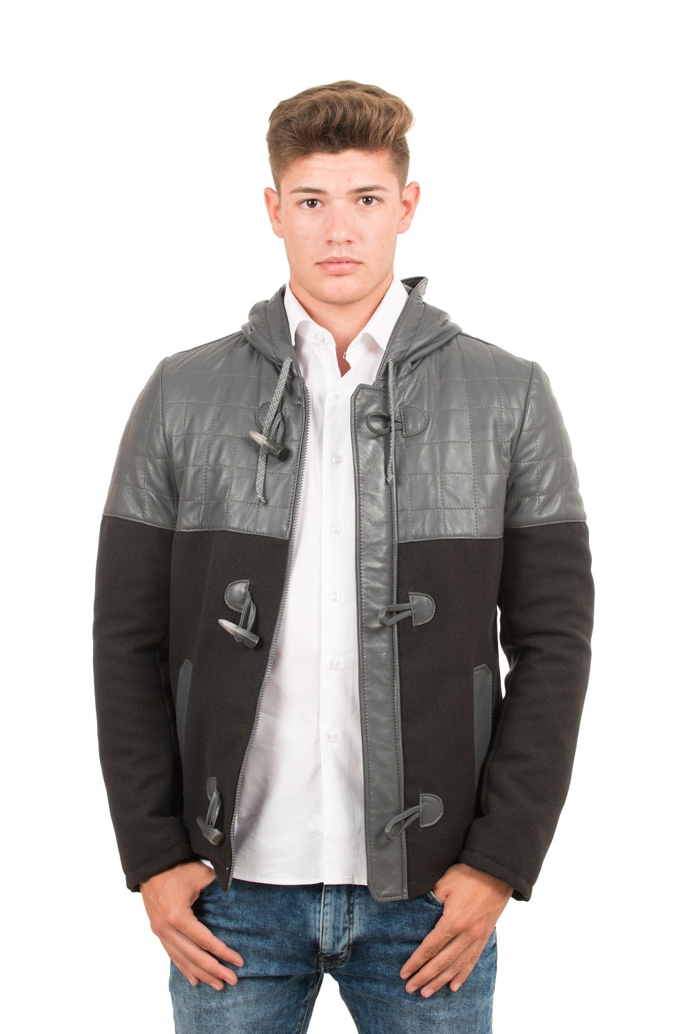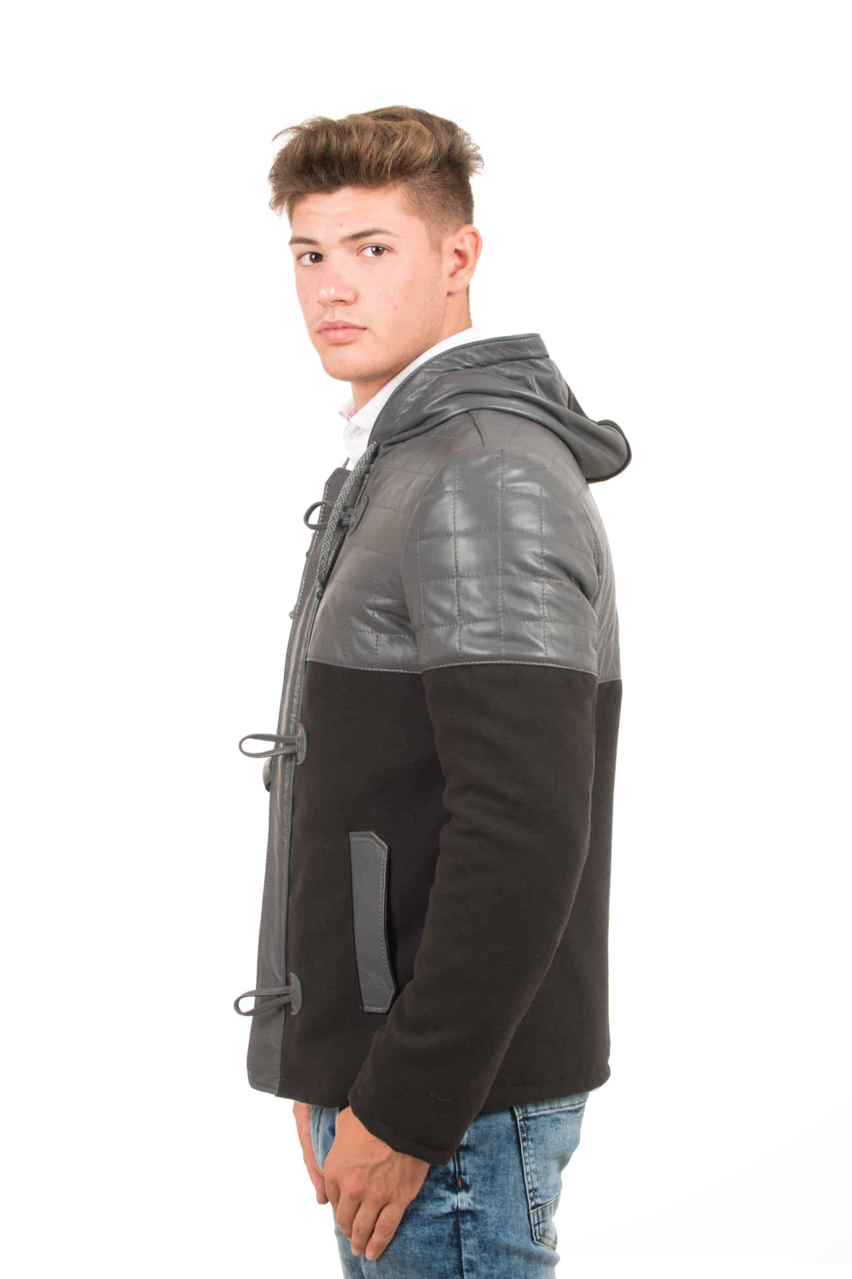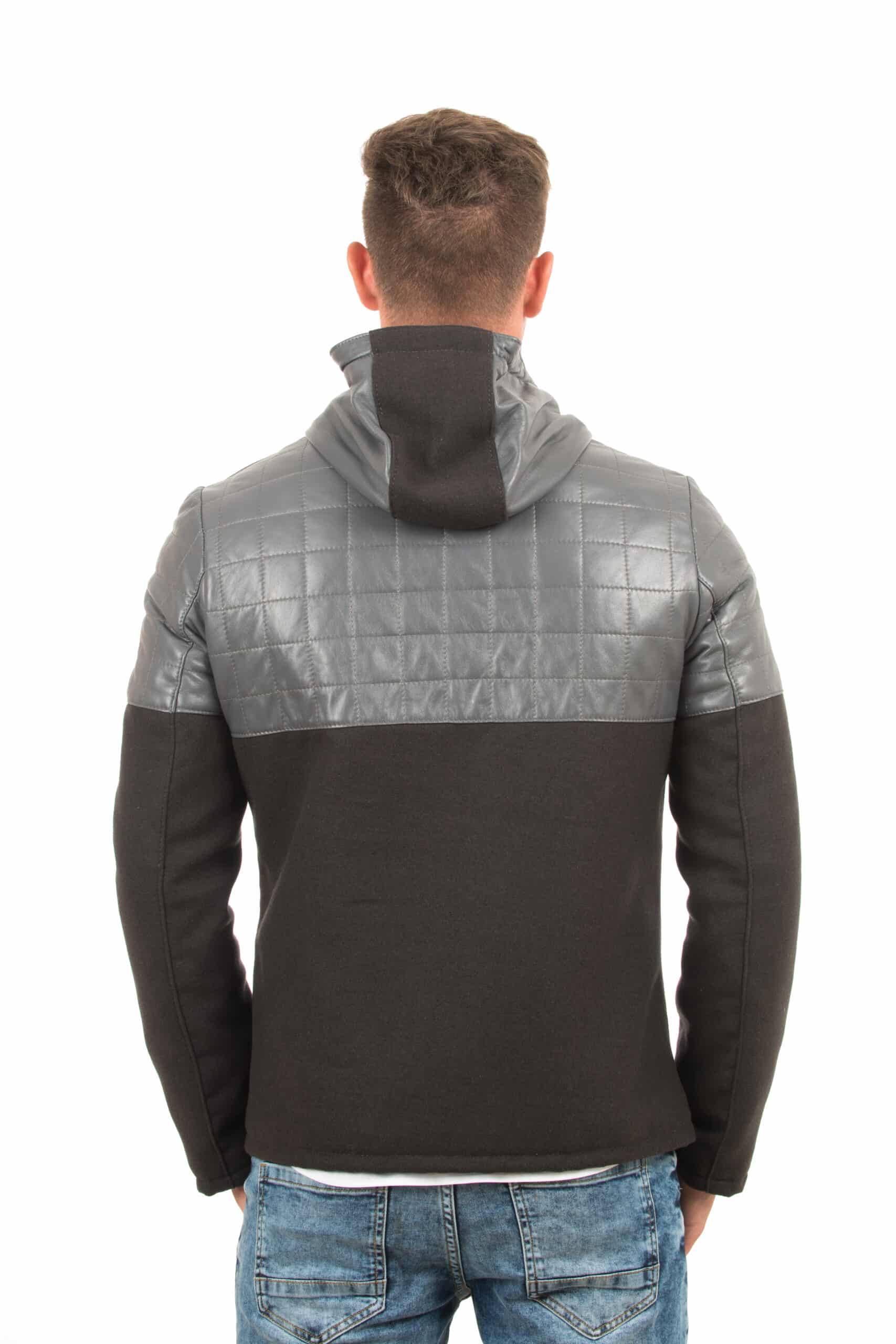 Giubbotto in pelle  meta tessuto lana 100% meta Pelle  davanti trapuntato e dietro trapuntato con cappuccio