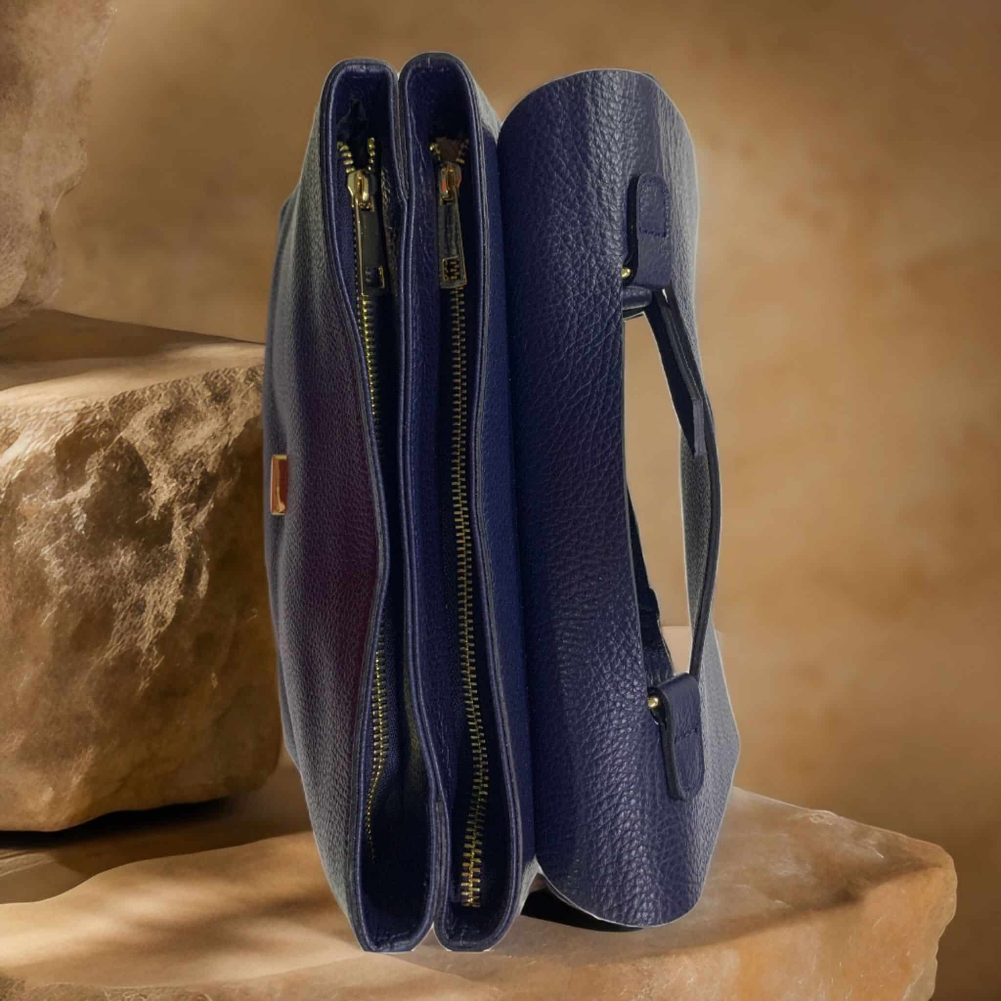 Borsa in pelle con tracolla regolabile,  tasche con due  zip all’interno.