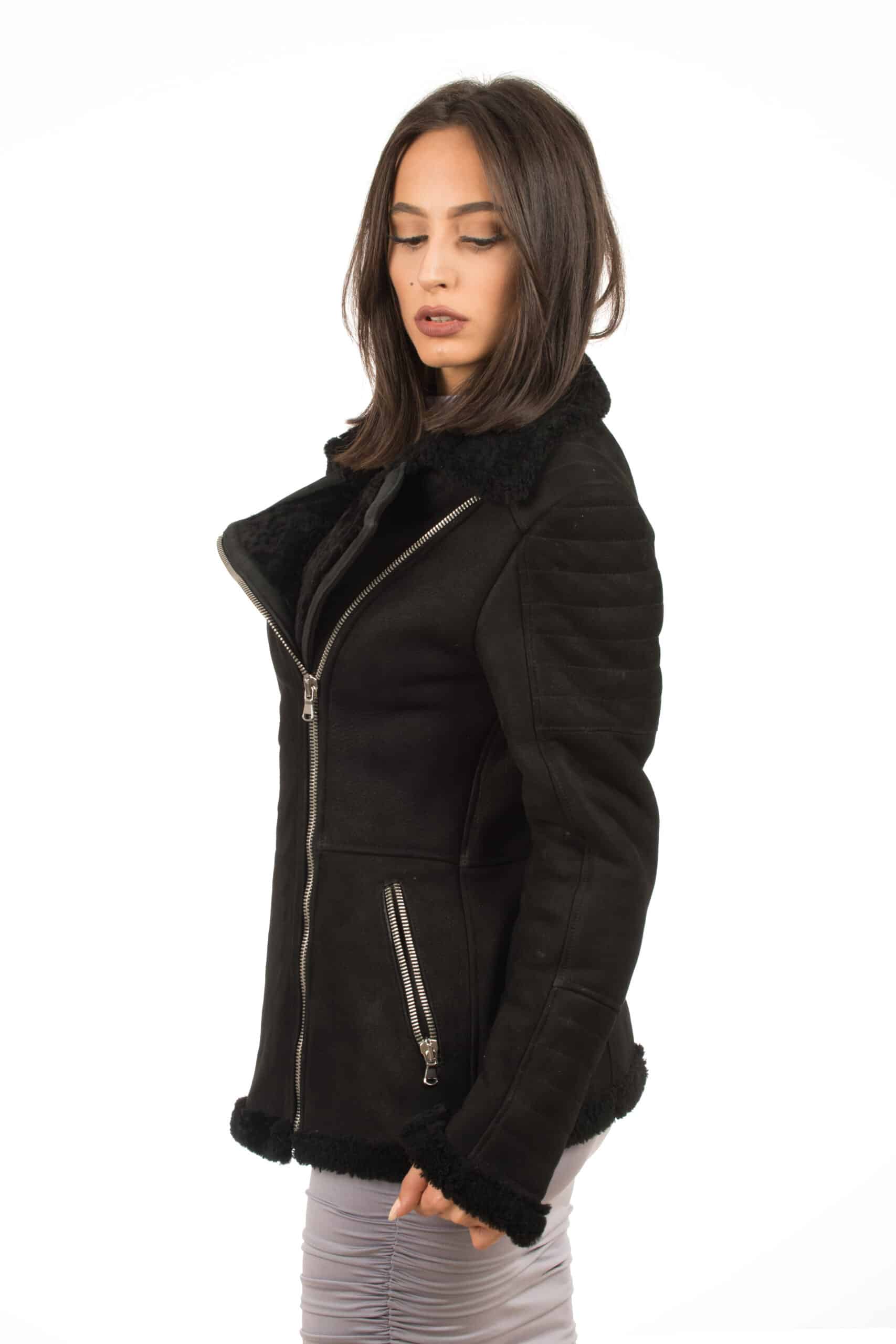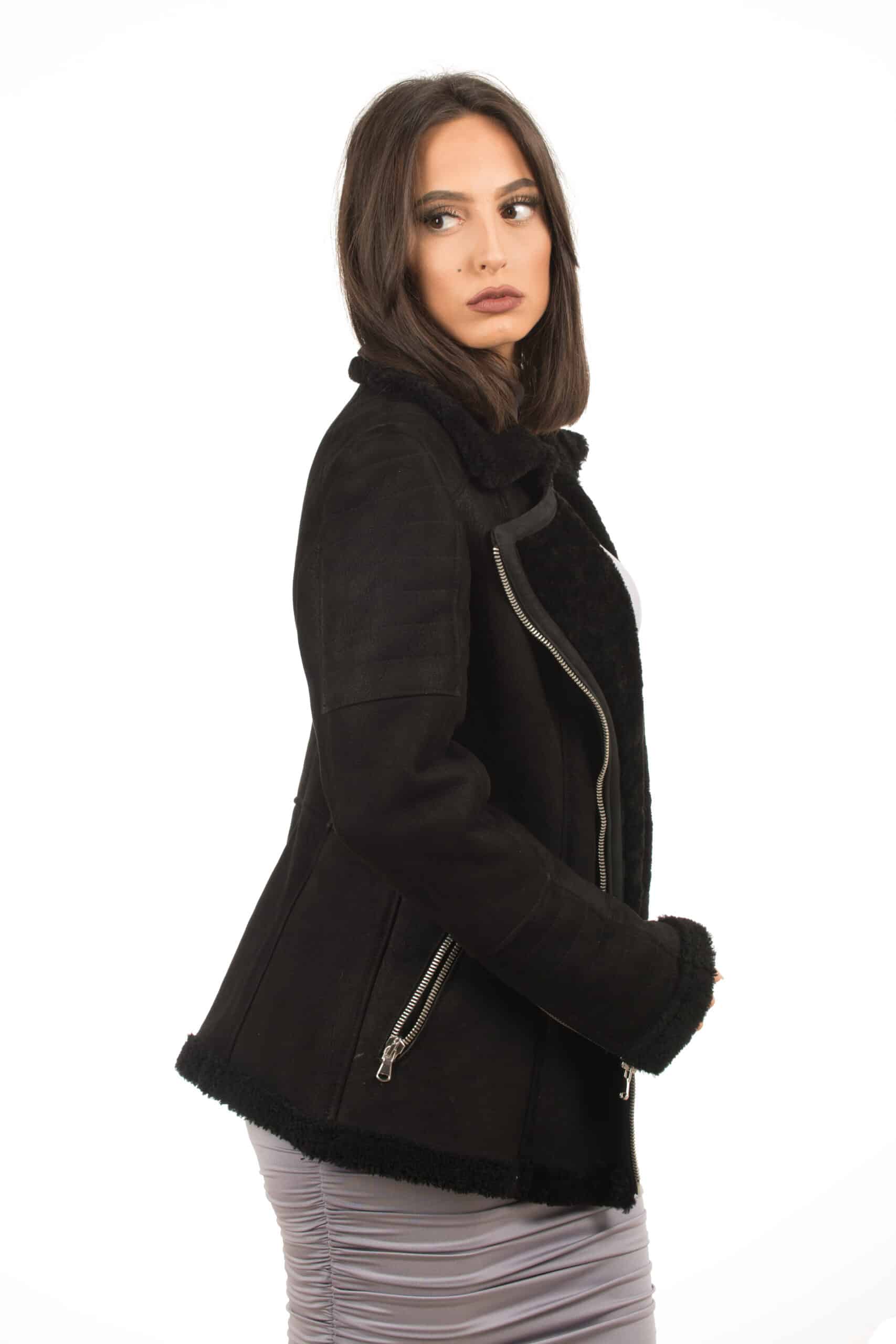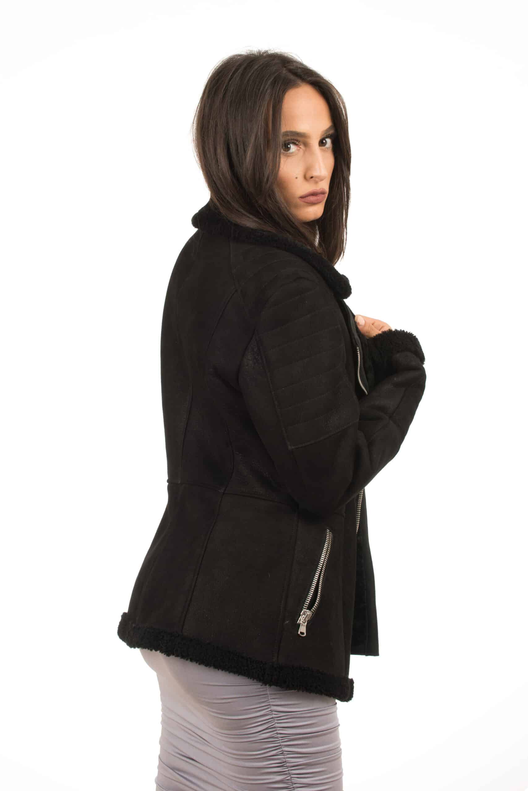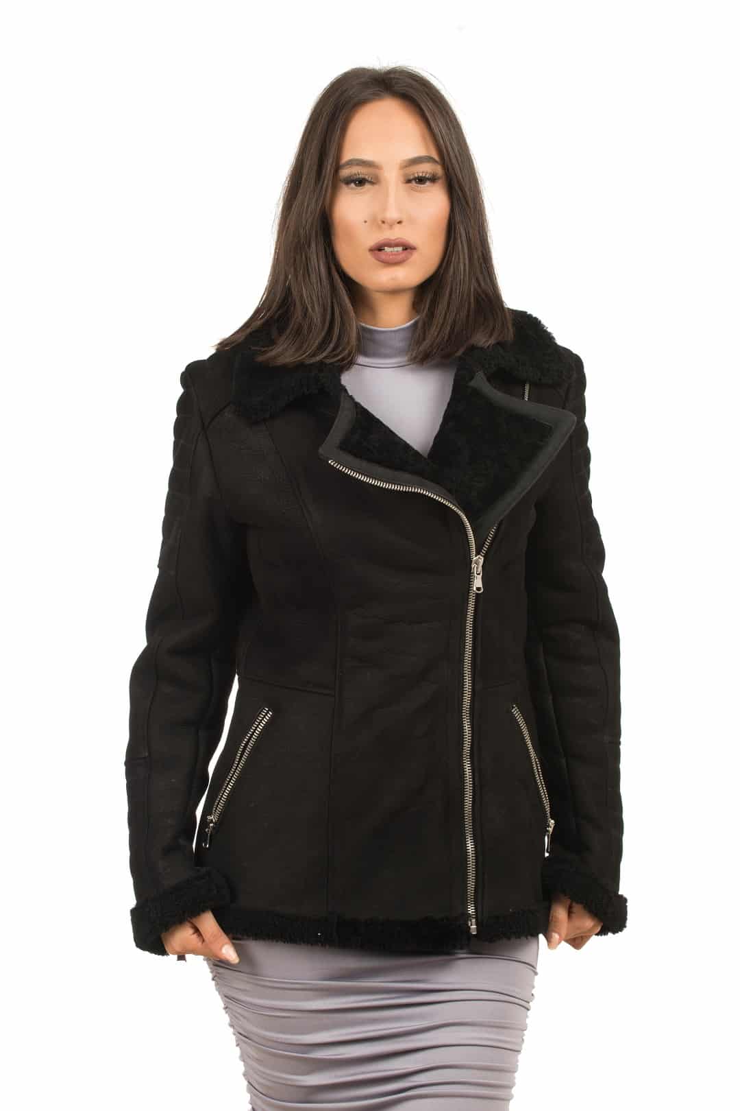 La giacca MINSKA è realizzata in montone shearling, chiusura trasversale e tasche con chiusura a zip, l’interno è in shearling, per una estrema sensazione di comfort e di calore