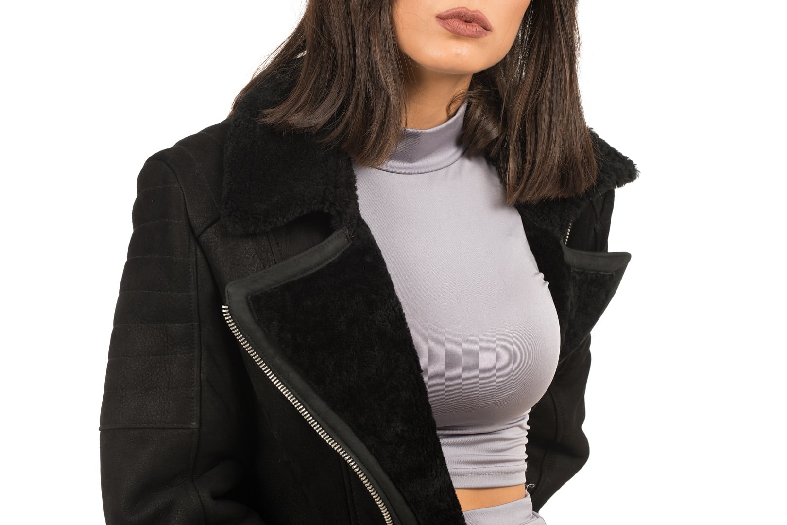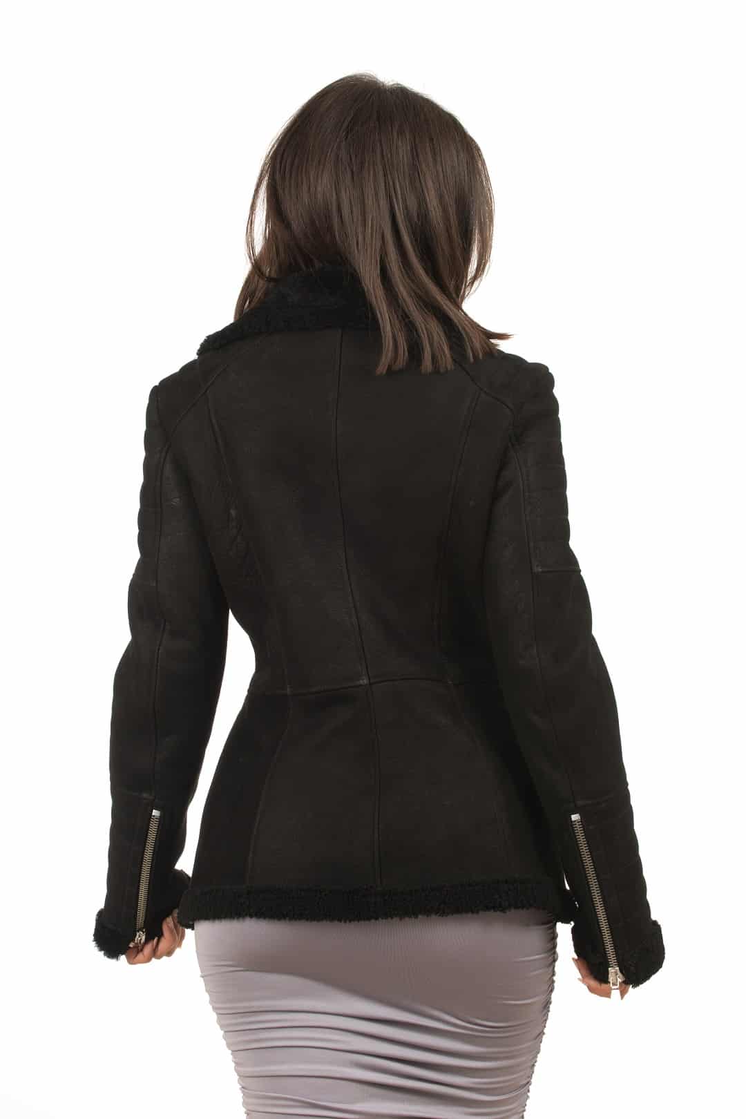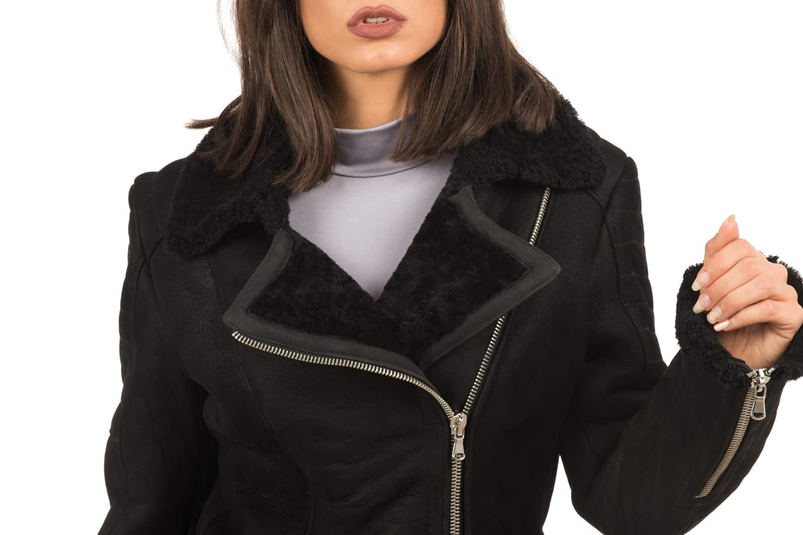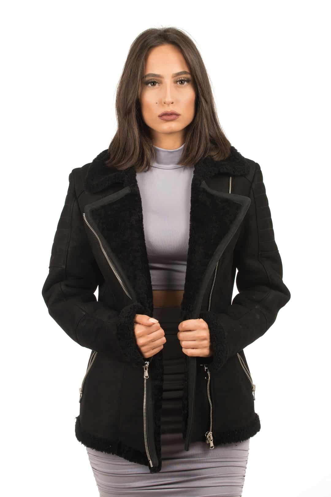 La giacca MINSKA è realizzata in montone shearling, chiusura trasversale e tasche con chiusura a zip, l’interno è in shearling, per una estrema sensazione di comfort e di calore